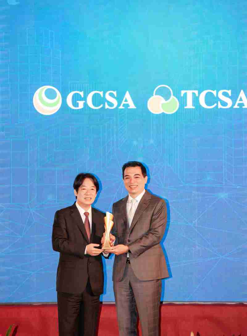 达全方位永续表现获全球永续奖及台湾永续奖肯定,,,,由副总统赖清德颁奖 (左),,尊龙集团总经理柯富仁 (右) 代表领奖