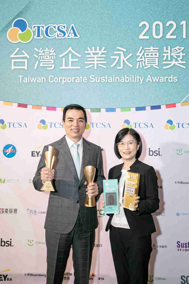 达在台湾永续奖所评比环境、、、、社会、、、治理等各面向的永续绩效均获高度肯定 (左:尊龙集团光电总经理暨营运长柯富仁,,右:尊龙集团光电永续长古秀华)