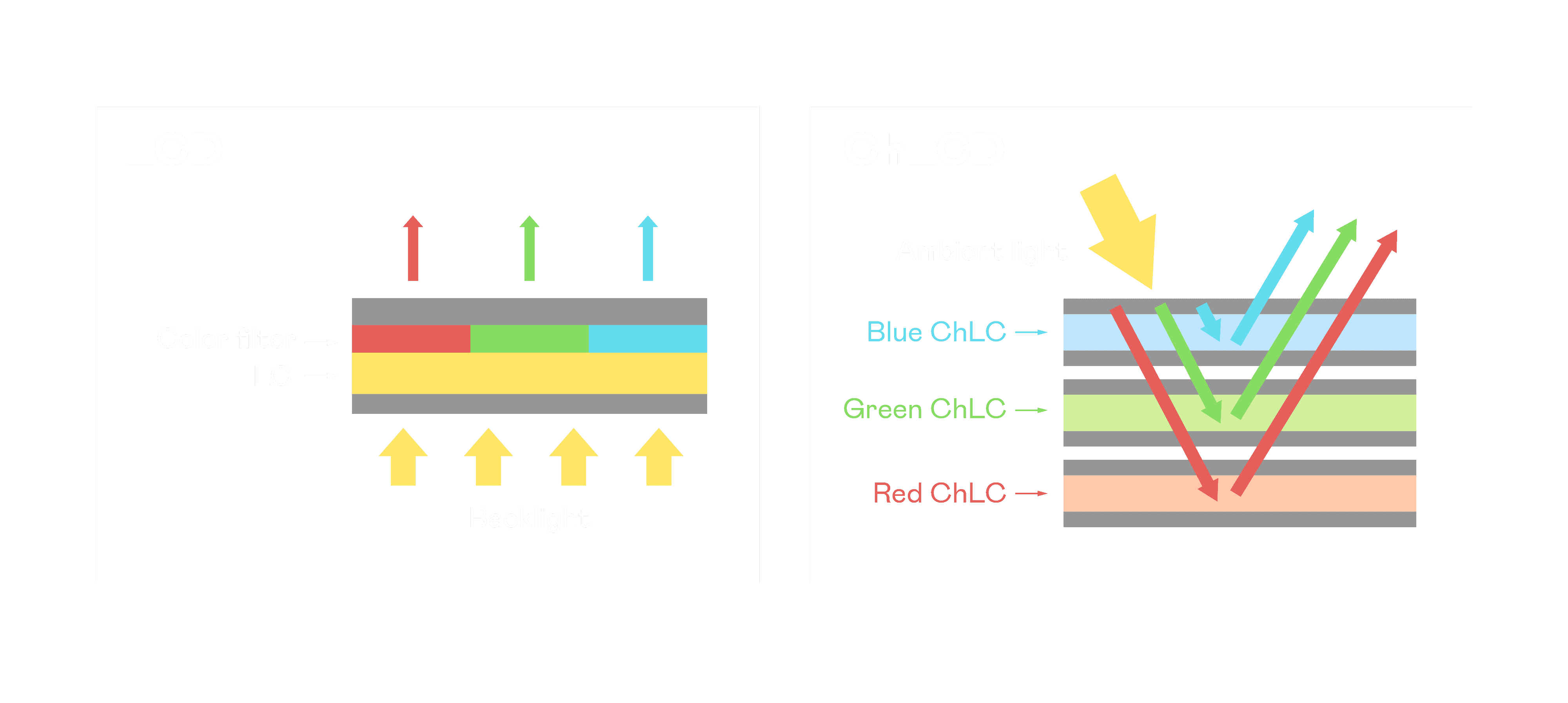ChLCD 胆固醇液晶就如同纸张一样,,透过反射环境光来显示影像,,,,因此长时间观看不易造成人眼视觉疲劳,,,,可达到护眼效果。。当处于户外阳光下使用,,,,LCD 影像容易失真而不易观看,,,,但胆固醇液晶仍可维持较佳的影像品质。。。