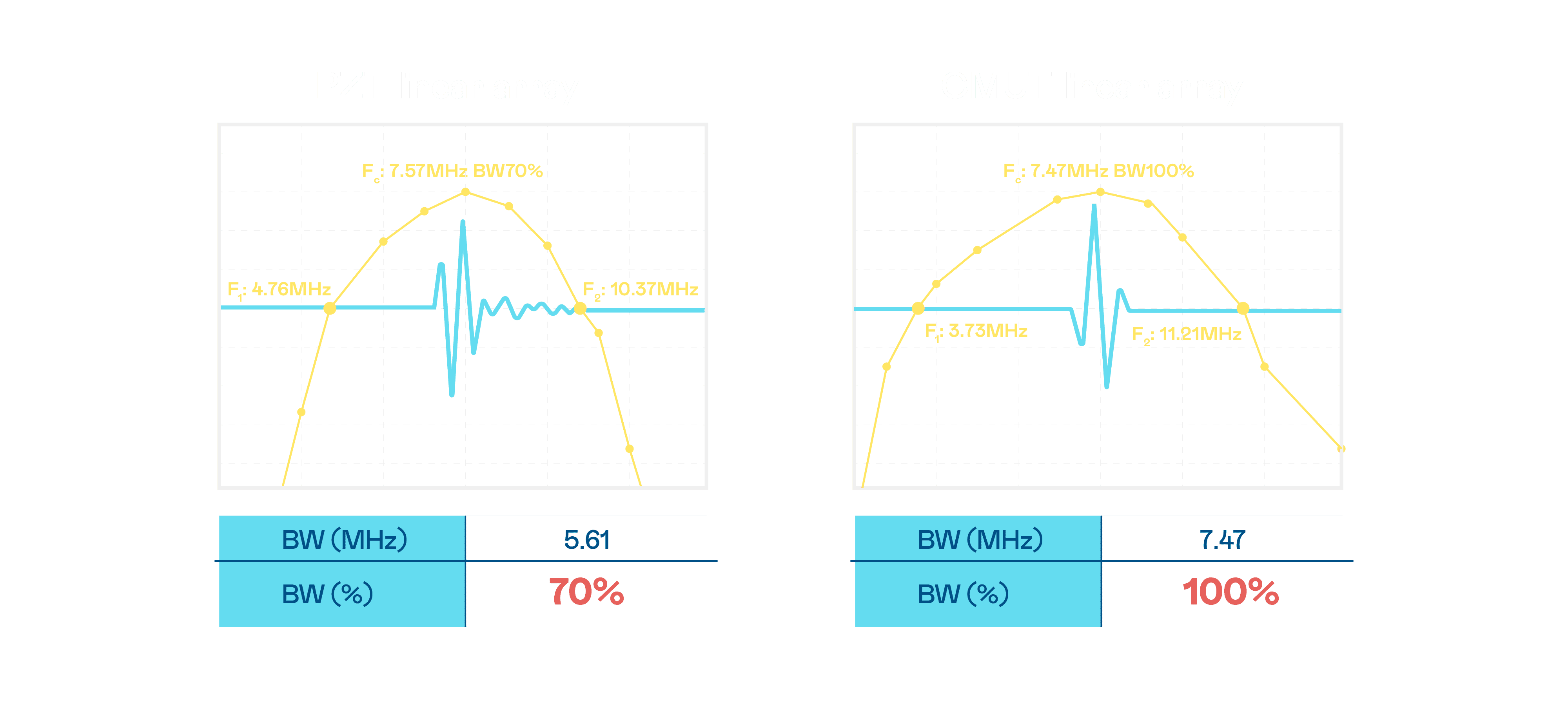 超音波影像的解析度高低,,首先取决于探头能发出的讯号频宽。。。。尊龙集团 CMUT 可提供高清晰的超音波讯号,,,提供高频宽、、、、高灵敏度、、、影像纹理细节更高的超音波影像,,协助医护人员缩短影像判读时间及利用精准的医疗影像进行诊断。。。。